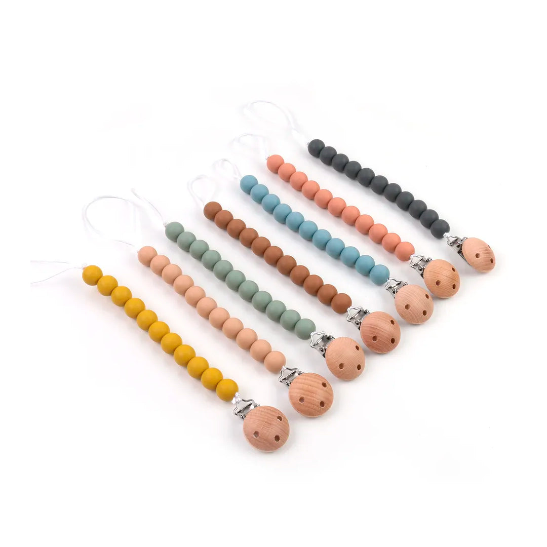 Sujetador de madera para Chupa, portachupas en cadena de bolitas con clip para ajustarlo a la ropa del bebé