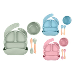 Vajilla en set de 5 piezas en silicona, cubiertos con mango de madera, libre de PVC, BPA y látex, antideslizante con babero ajustable - Color&Life