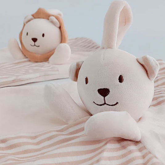 Apego con diseño de animalitos, hecha algodón super suave, estimula los sentidos del bebé, es calientito, y al moverlo emite sonidos suaves.