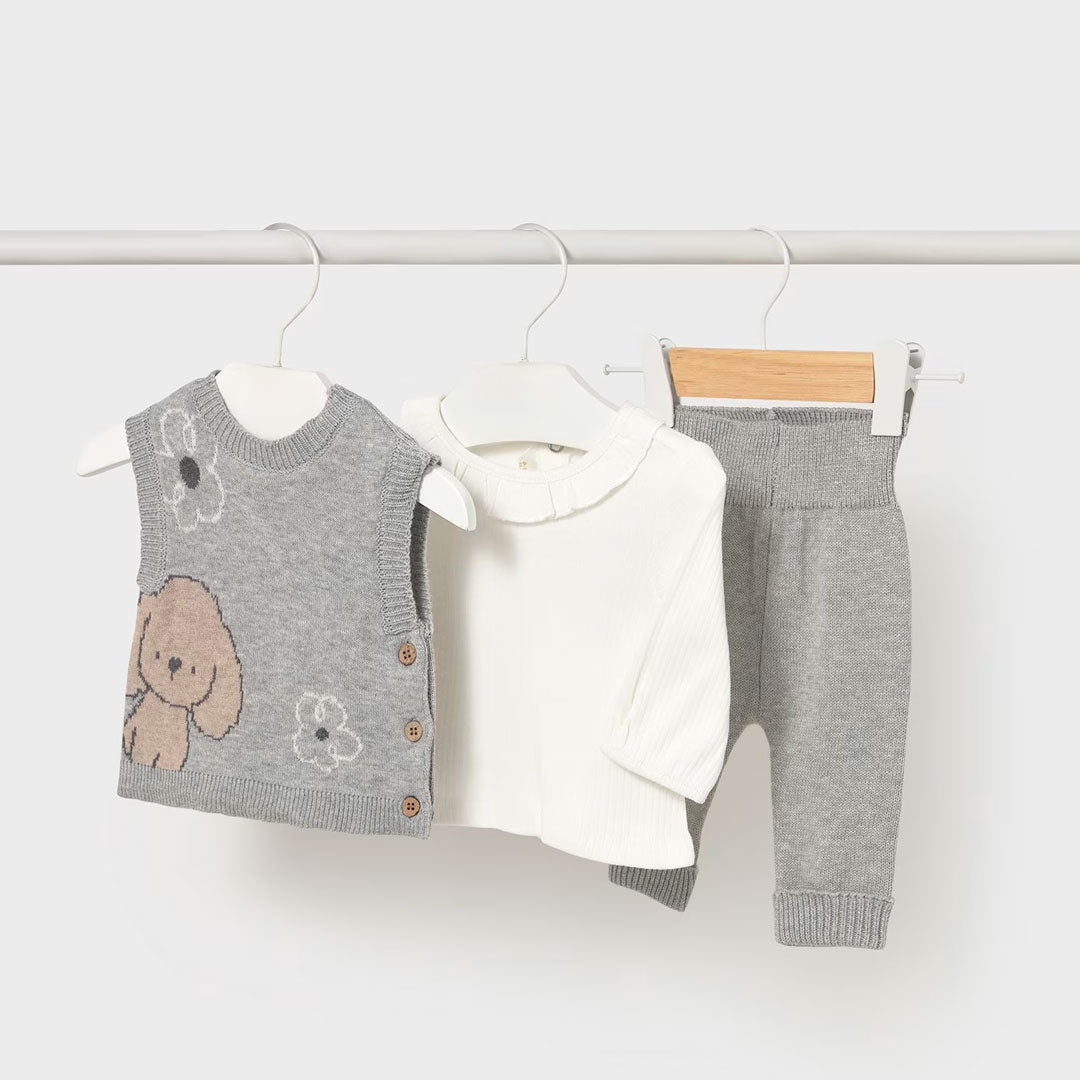 Conjunto 3pz chaleco gris diseño bordado perrito, camiseta de manga larga con cuello redondo con volante, chaleco sin mangas, pantalón tipo legging - Mayoral
