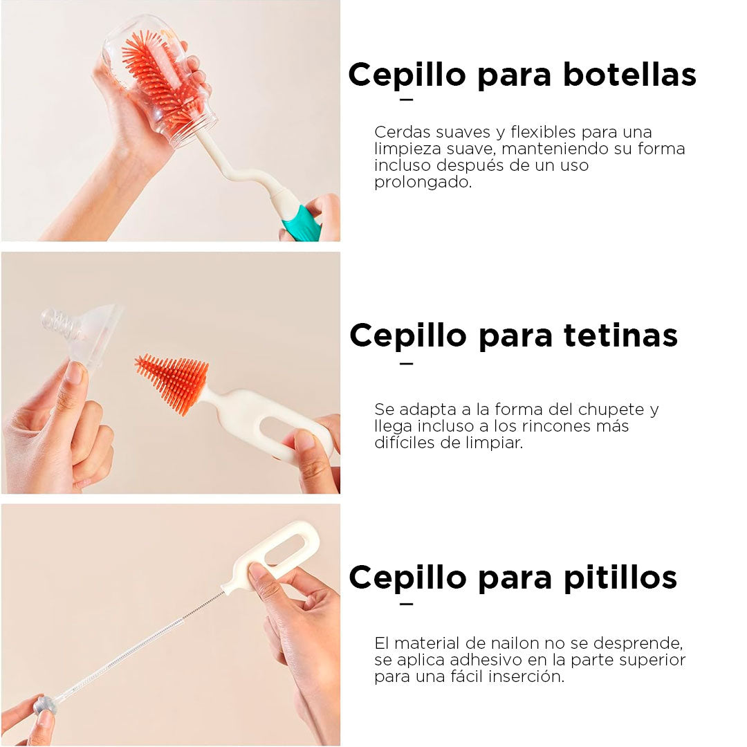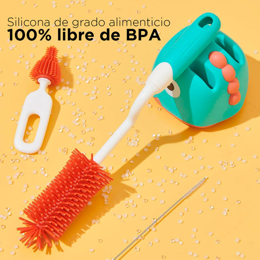 Juego de cepillos con soporte para teteros y accesorios, set de aseo para biberones 3 en 1 fácil de limpiar y secar, hecho en silicona de grado alimentario y 100% libre de BPA