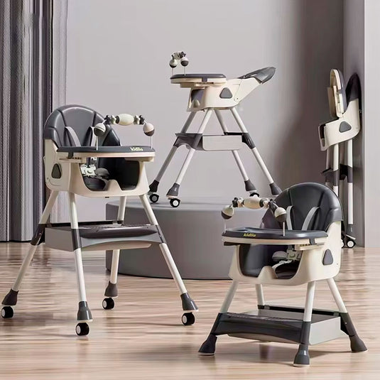 Silla comedor con sistema plegable y doble bandeja, multifuncional, ajustable como silla alta y baja, con ruedas para facilitar el moverla, con arnés en 5 puntos - Kidilo