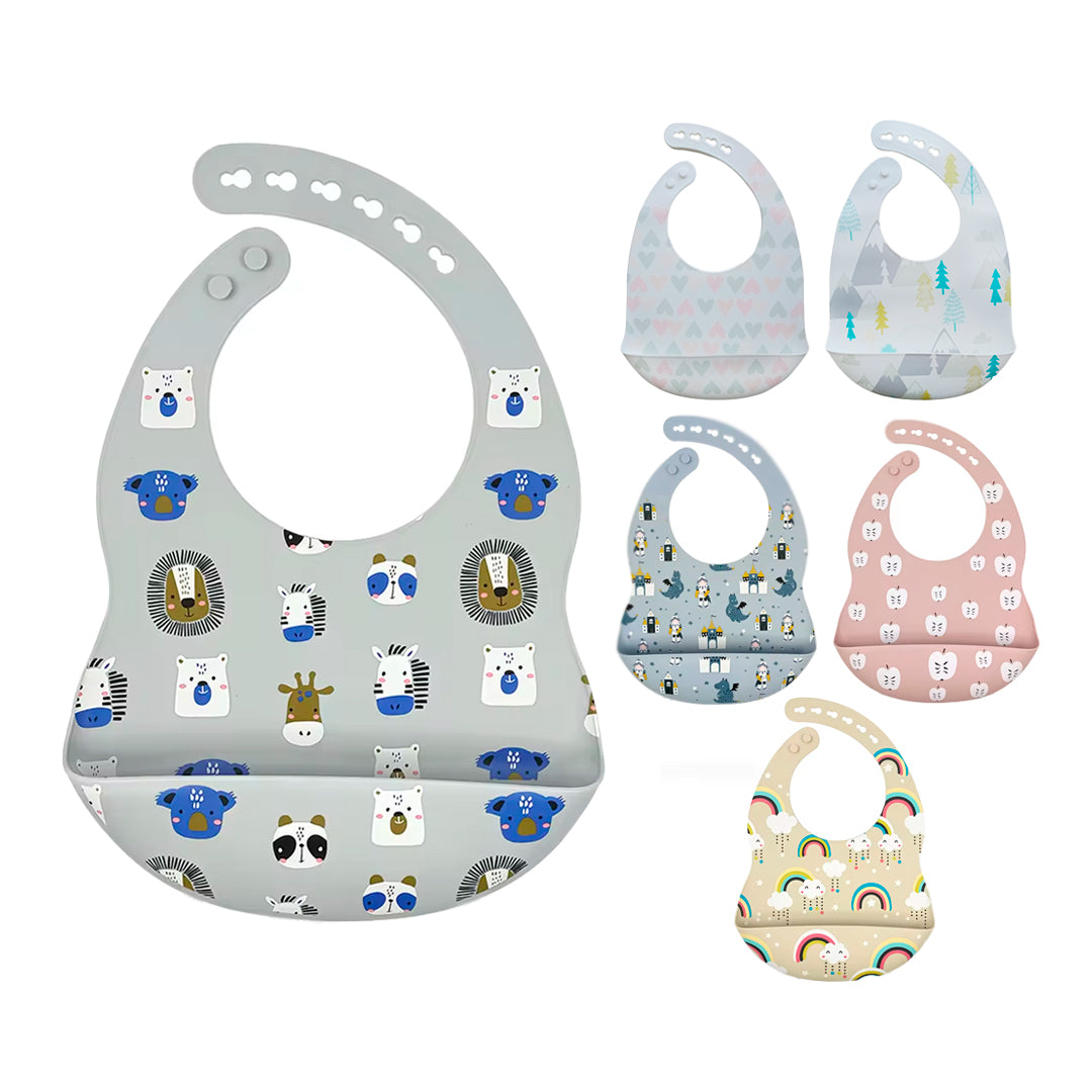 Babero recolector ajustable en silicona, grado alimenticio libre de BPA, con diseño estampado