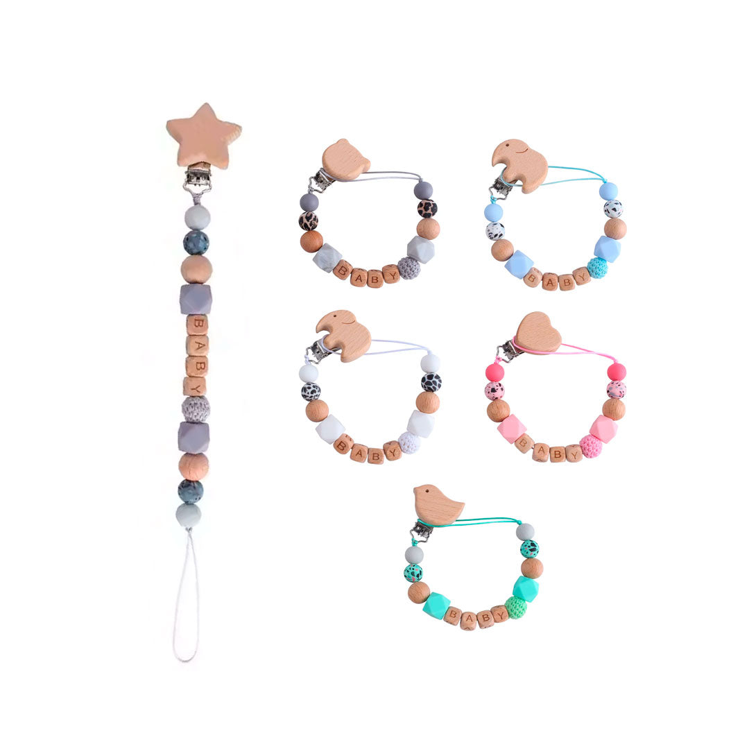Portachupas con detalles en madera tallada para bebé, con figura de adorno en el gancho, cadena libre de BPA para chupete, soporte en clip para la ropa - Only Baby