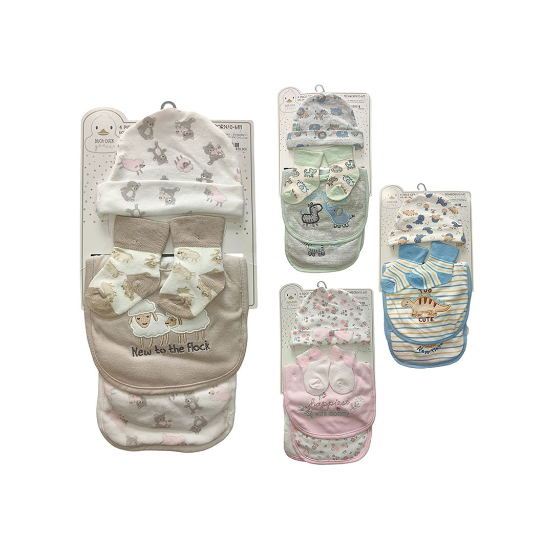Set 4pz con babero, babita, gorro y medias a juego para bebé, hechos en algodón hipoalergénico, babero absorbente, con diseño estampado