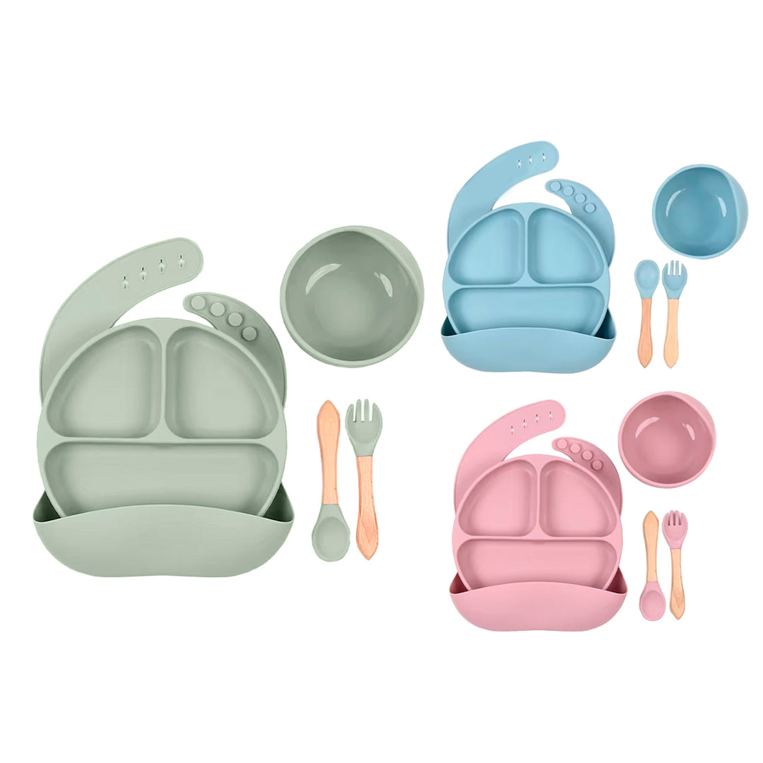Vajilla en set de 5 piezas en silicona, cubiertos con mango de madera, libre de PVC, BPA y látex, antideslizante con babero ajustable - Color&Life