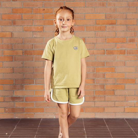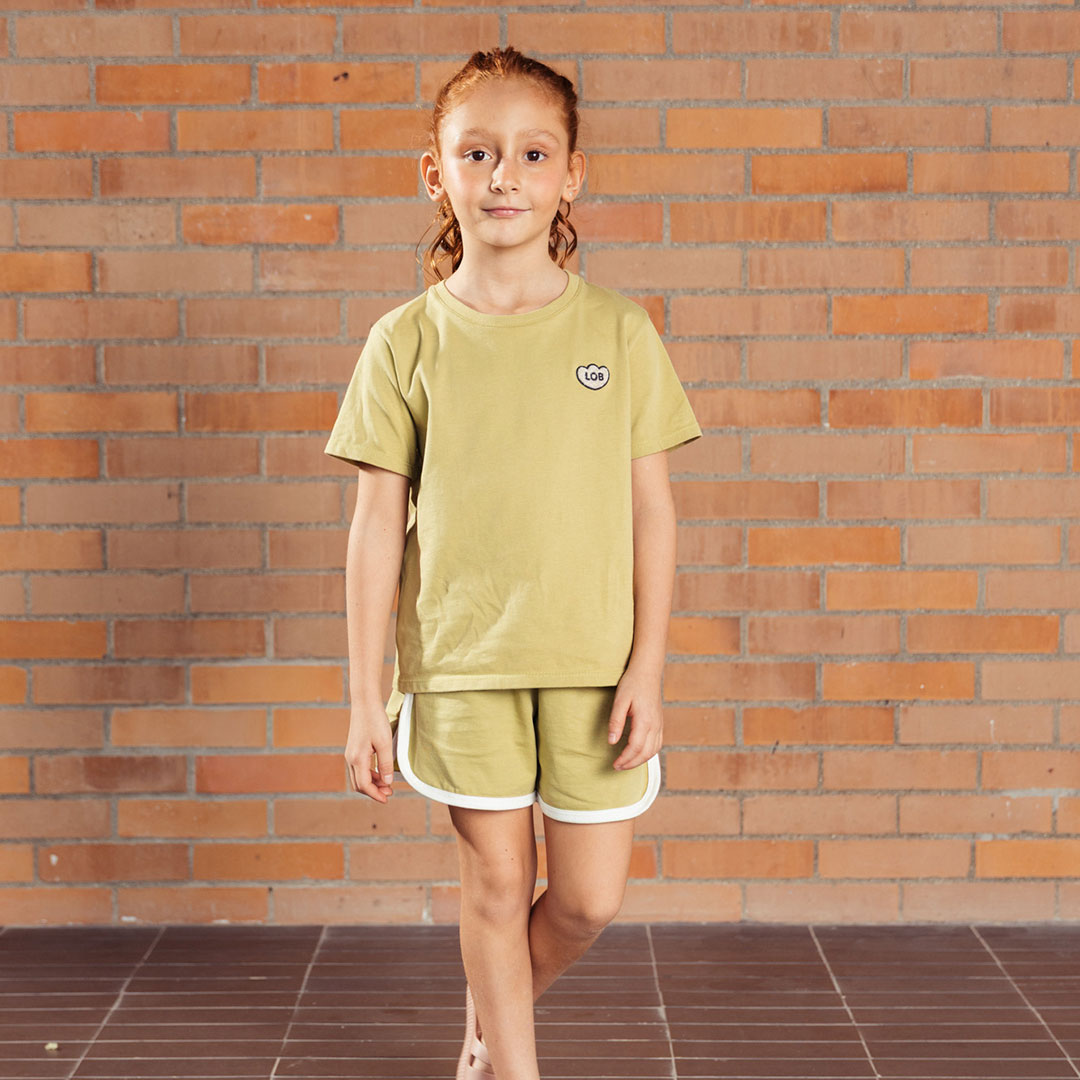 Camiseta infantil MIXER color verde matcha, para niñas y niños, con fit suelto, de manga corta, cuello redondo con rib y detalle de "LOB" bordado con textura súper suavecita en el pecho. Esta camiseta tiene un color verde tan ceremonial como el té matcha. Nos encanta!