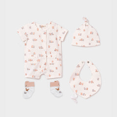 Conjunto de 4pz pijama, babero, gorro y medias a juego para bebé, pijama de manga corta, babero con diseño estampado, cuello cruzado y abertura lateral con botones a presión, con gorro y par de medias a juego - Mayoral