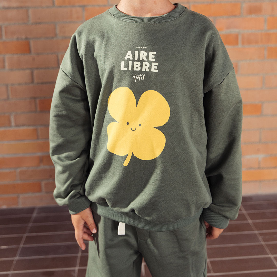 Buzo verde militar estampado trébol amarillo, hecho en tela suave y delicada al tacto, con diseño estampado en el frente y un detalle narrativo en la parte trasera - LOBSTER mini