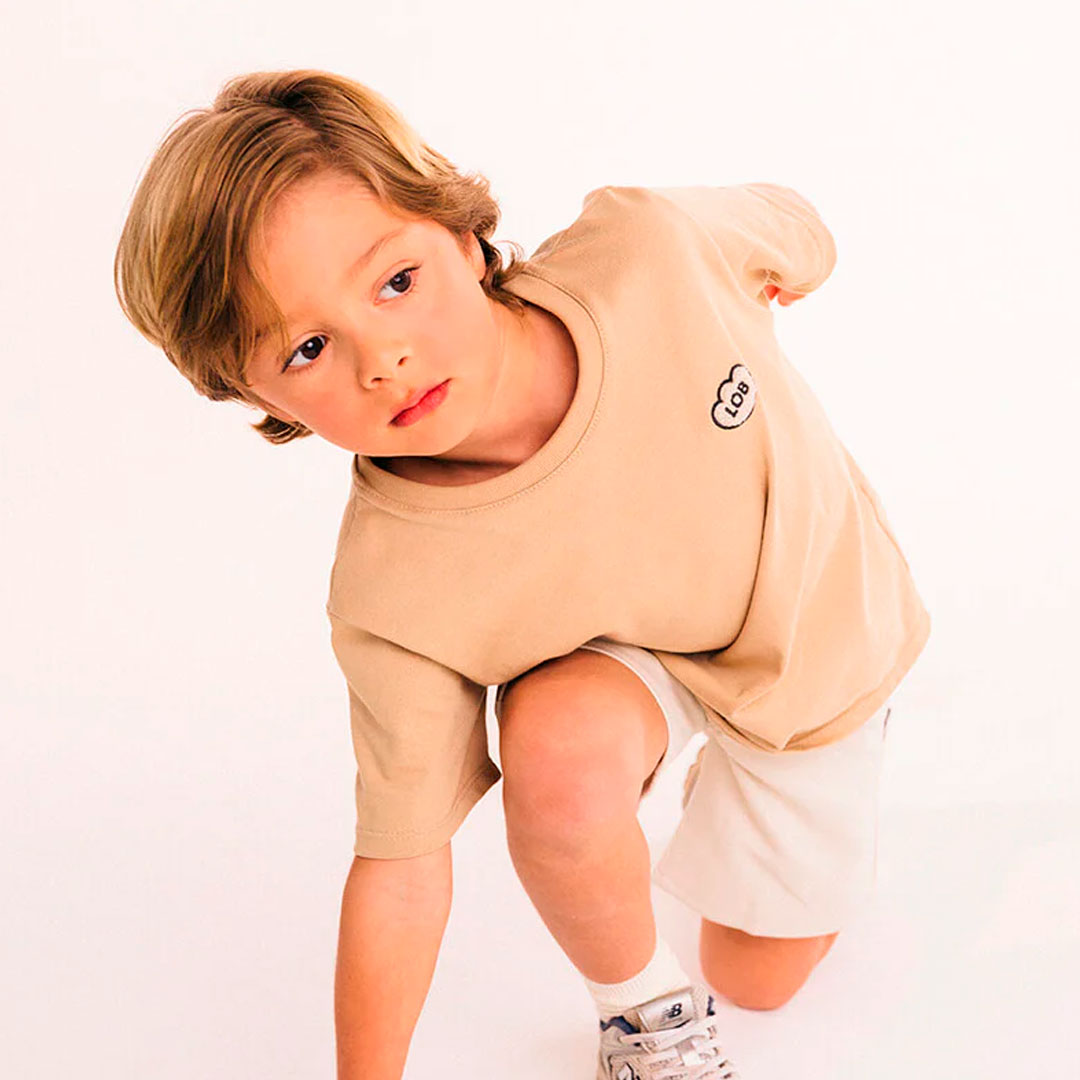 Camiseta infantil MIXER color café explorador, para niñas y niños, con fit suelto, de manga corta, cuello redondo con rib y detalle de "LOB" bordado con textura súper suavecita en el pecho. Esta camiseta tiene un color verde tan ceremonial como el té matcha. Nos encanta!