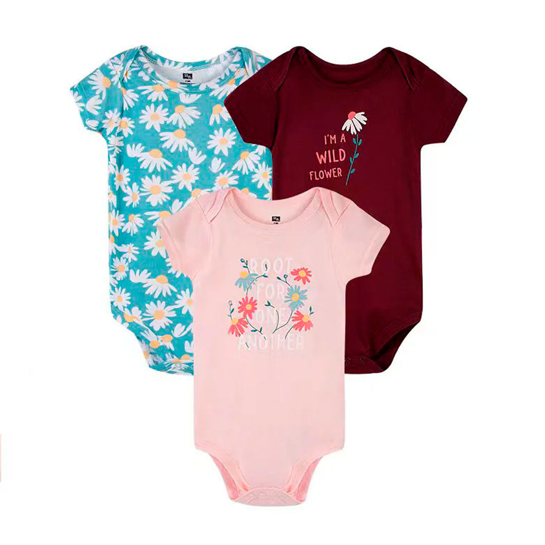 Set de mamelucos x3 flores rosa y Vinotinto, paquete de tres mamelucos de manga corta, con diferentes diseños y colores, tela transpirable y antialérgica - Hudson Baby