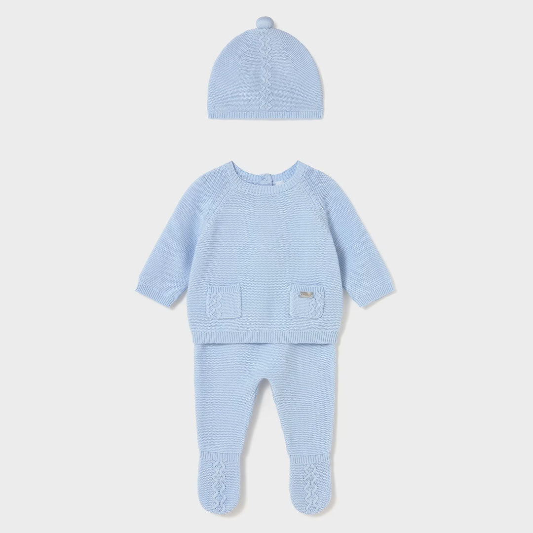 Conjunto de tres piezas tejido para recién nacido, buzo de manga larga, cierre con botones en la espalda para facilitar la puesta de la prenda, bolsillos funcionales en la parte delantera, cinturilla elástica - Mayoral
