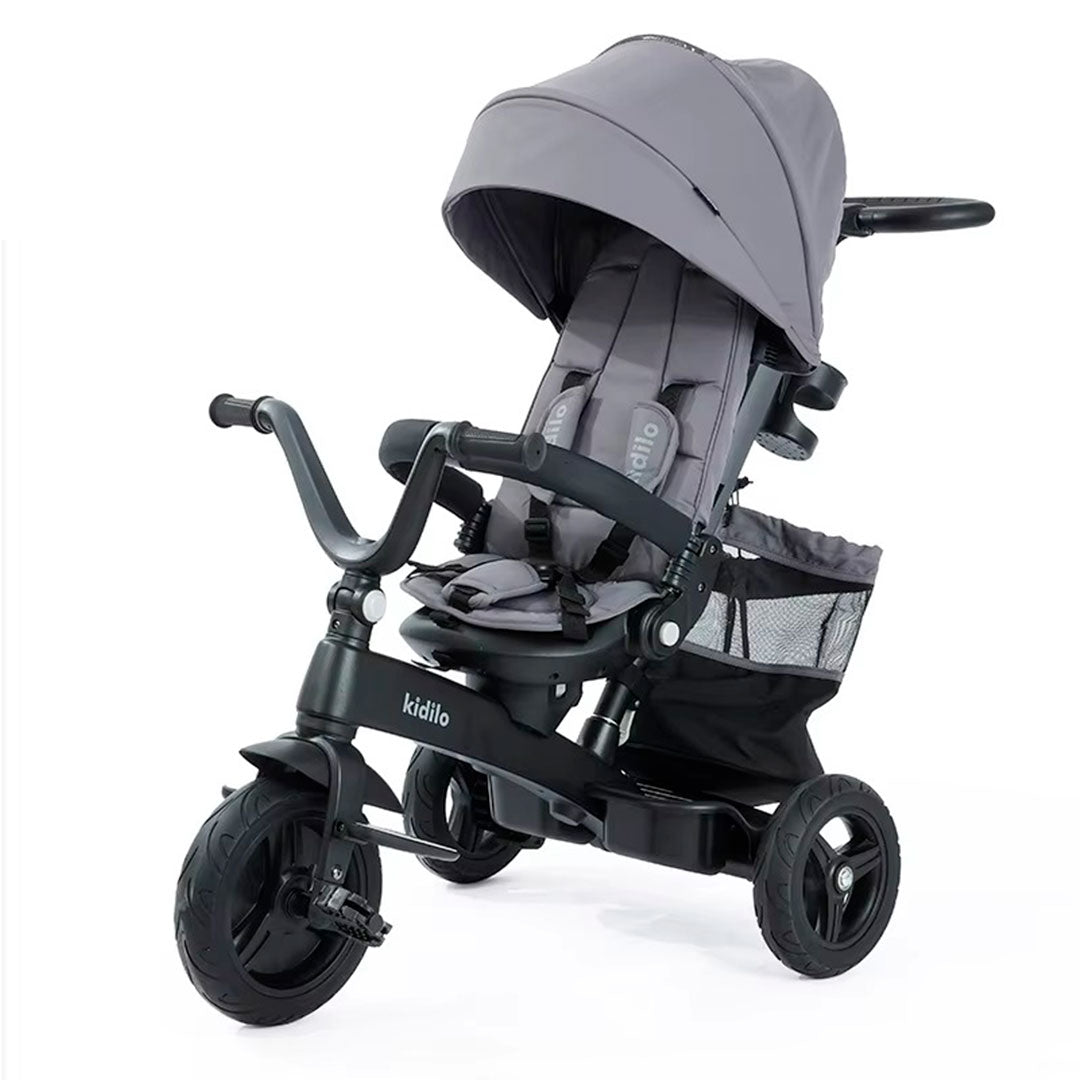 Coche paseador estilo Triciclo Deluxe, con sistema de plegado, asiento ajustable con rotación 360°, manillar de control parental, canasta de almacenamiento, campanilla, cinturón de seguridad de 5 puntos - Kidilo