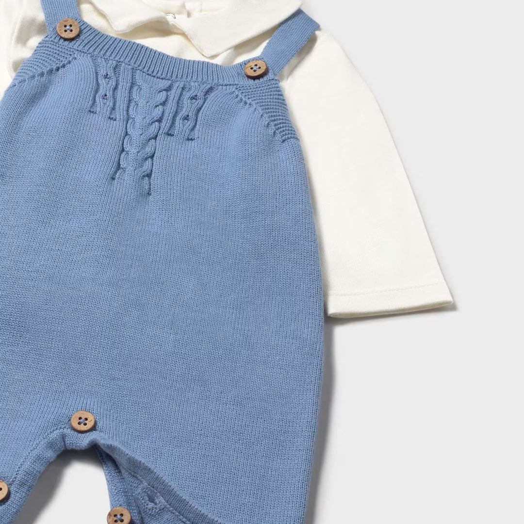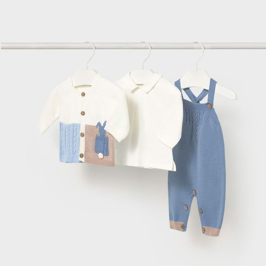 Conjunto 3 piezas con Overall tejido para recién nacido, tipo cárdigan de manga larga, cuello redondo, cierre con botones a presión en la entrepierna para facilitar la puesta- Mayoral