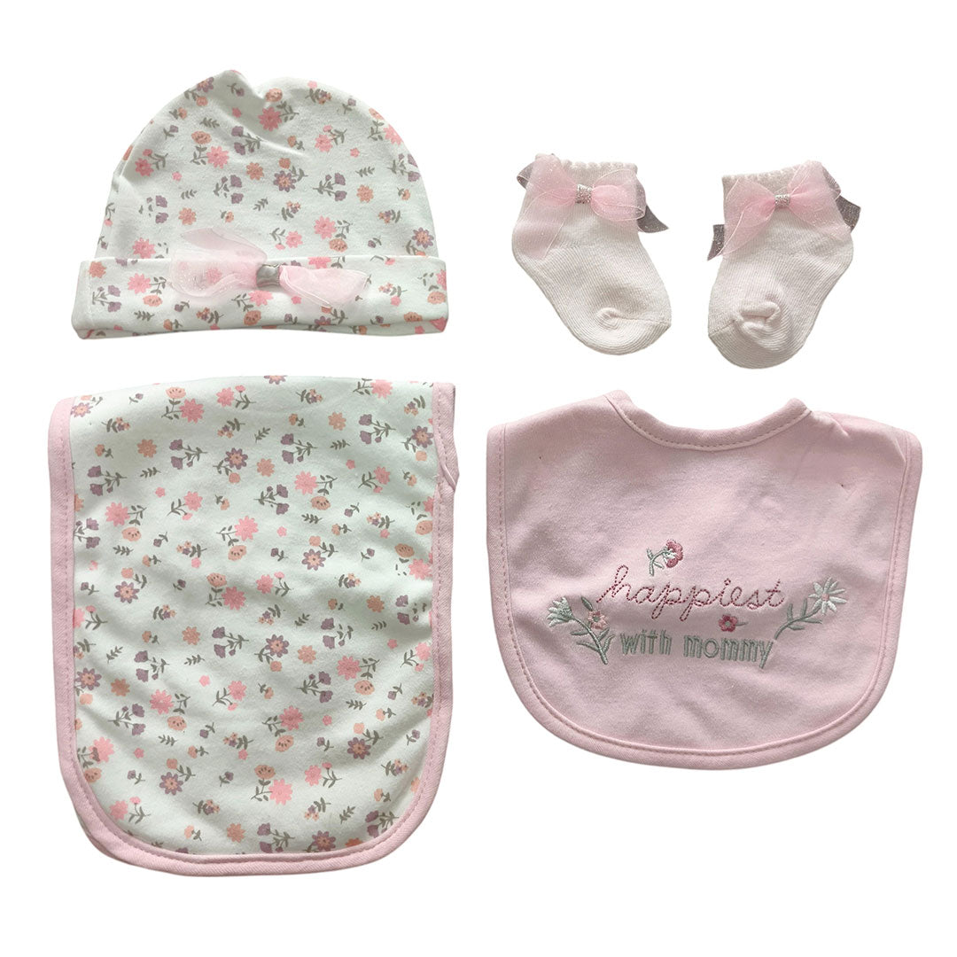 Set 4pz con babero, babita, gorro y medias a juego para bebé, hechos en algodón hipoalergénico, babero absorbente, con diseño estampado