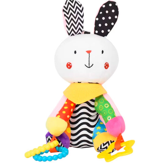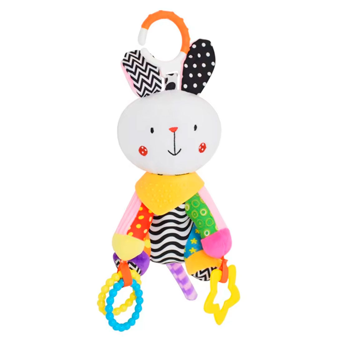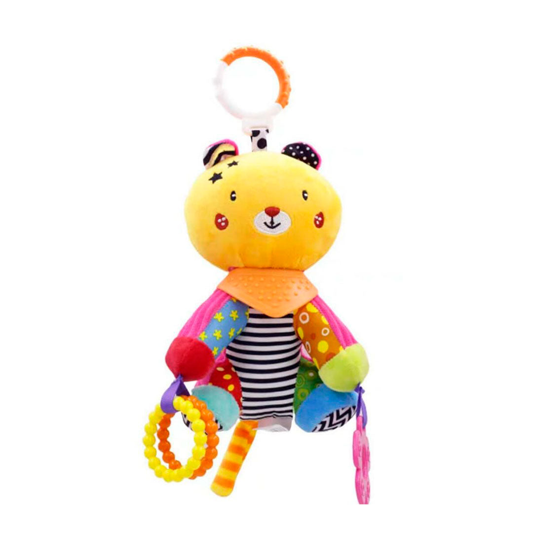 Sonajero peluche con bandana de rascaencias suave, móvil para colgar, hecho en material suave hipoalergénico, diseño y colores llamativos, con cascabel y mordedor