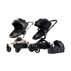 Además, este coche para bebé de lujo está hecha de cuero PU impermeable de alta calidad, lo que facilita la limpieza. Además de poder girar 360 grados, las ruedas a prueba de explosiones también están hechas de goma resistente a los golpes, lo que le da a este cochecito de bebé un andar refinado y suave con una excelente maniobrabilidad.