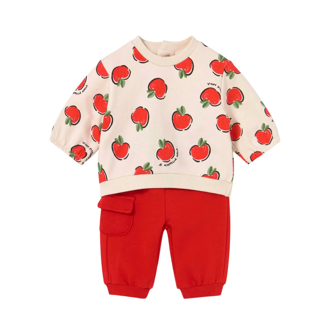 Conjunto 2pz diseño de manzanitas rojas para bebé, sudadera de manga larga para recién nacida, cuello redondo, cierre con botones a presión en la parte posterior, suave tejido de algodón elástico, cinturilla elástica con cordón - Mayoral