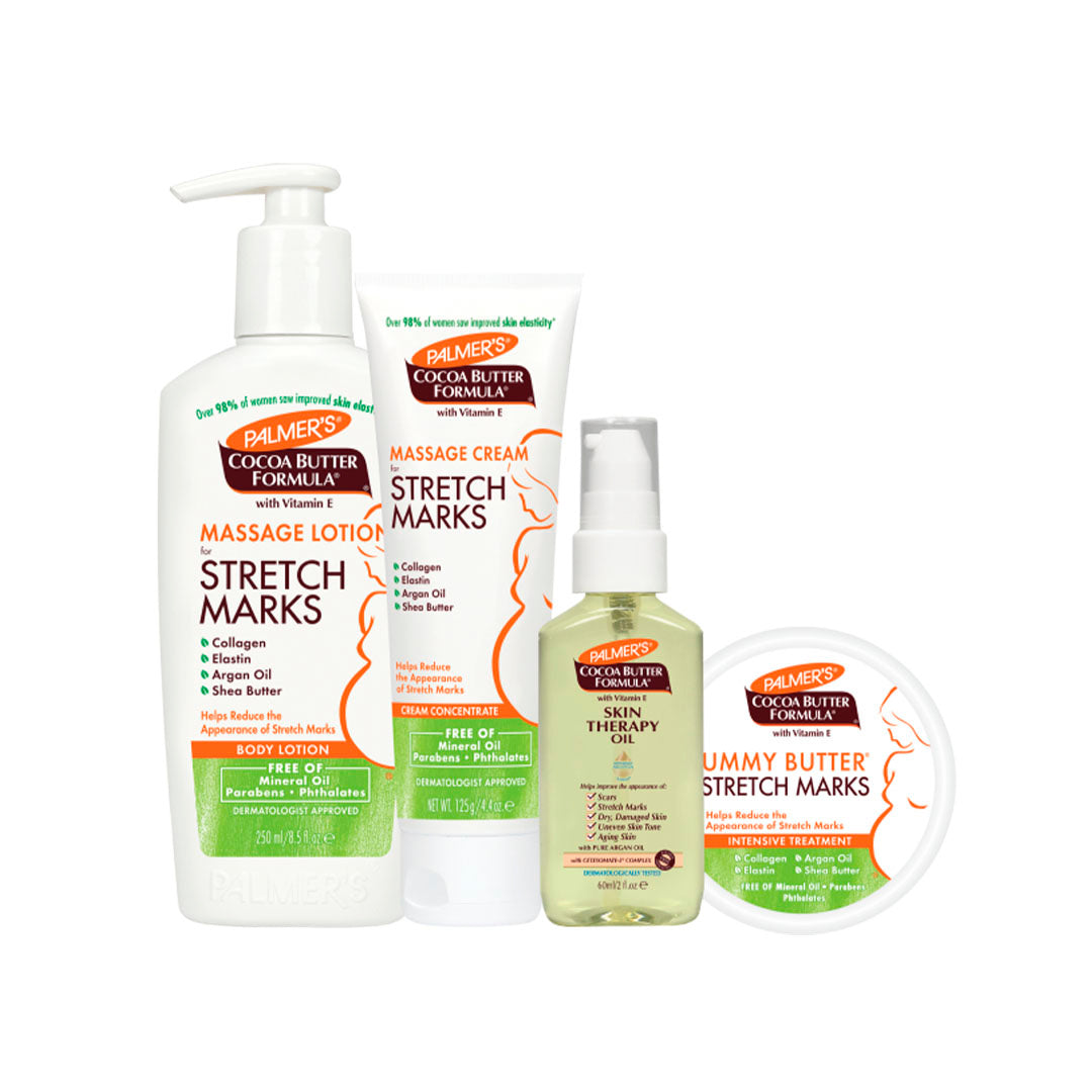 El kit de la fórmula de la manteca de cacao de Palmers (loción, aceite y crema) proporciona un régimen de cuidado de la piel prenatal que ayuda a mejorar visiblemente la elasticidad de la piel y reduce la aparición de estrías que ocurren durante y después del embarazo.