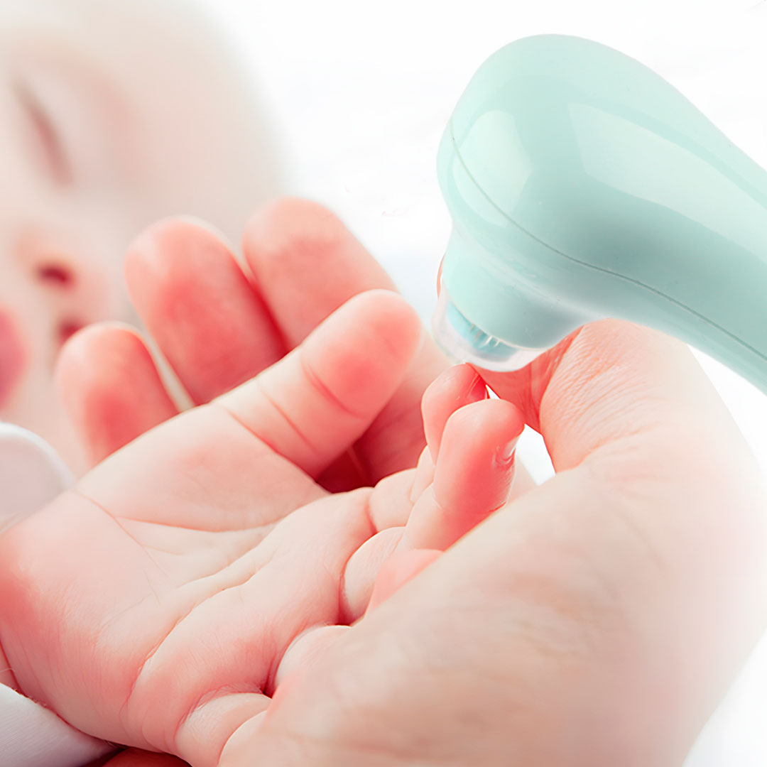 La Lima eléctrica recargable con cabezal intercambiable tiene una cubierta protectora frente a la almohadilla de molienda para evitar que el polvo de las uñas sea inhalado por el bebé.