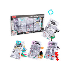Paquete x4 libros sensoriales de tela de contraste, con diferentes texturas y sonidos al tacto, hecho en material suave e hipoalergénico