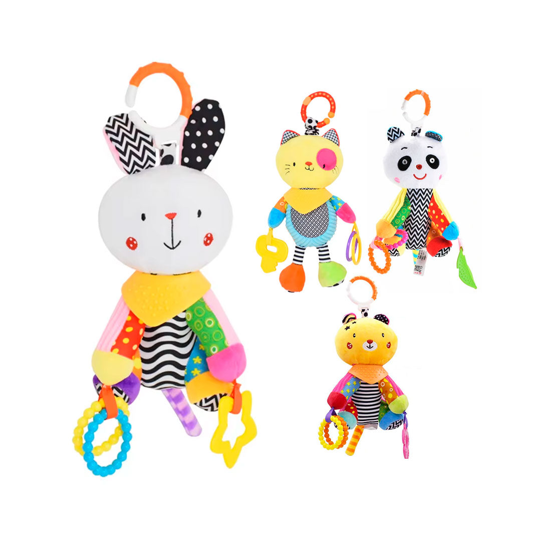 Sonajero peluche con bandana de rascaencias suave, móvil para colgar, hecho en material suave hipoalergénico, diseño y colores llamativos, con cascabel y mordedor