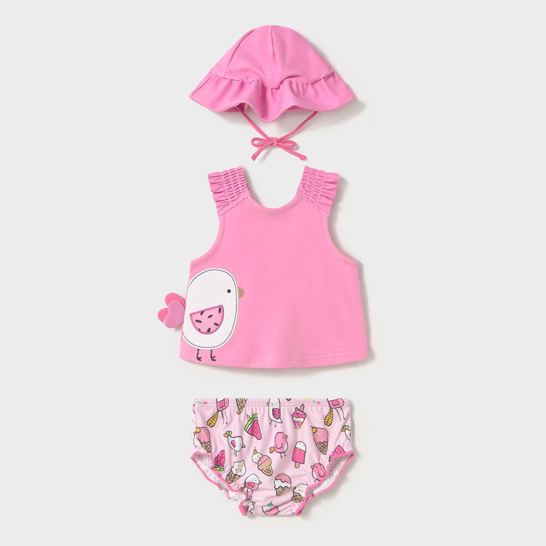 Vestido de baño Palomita rosa con heladitos para bebé, set de baño de 3pz con gorrito para protección solar, divertido diseño y color vibrante - Mayoral